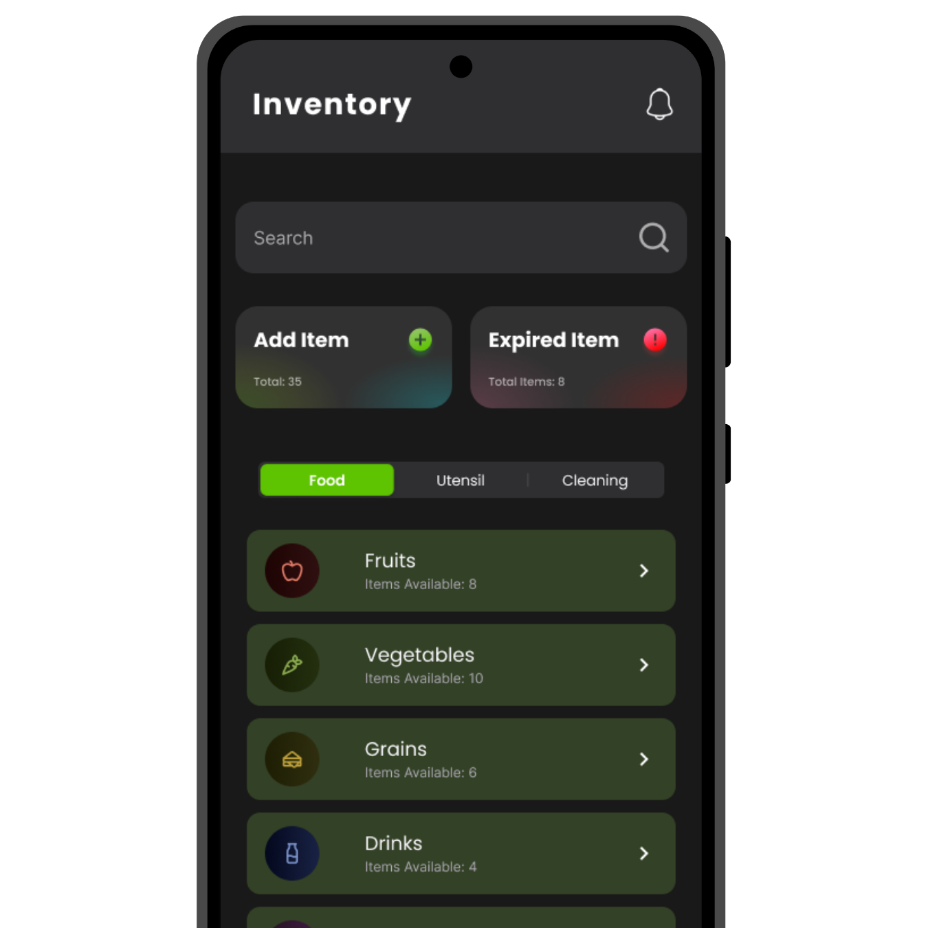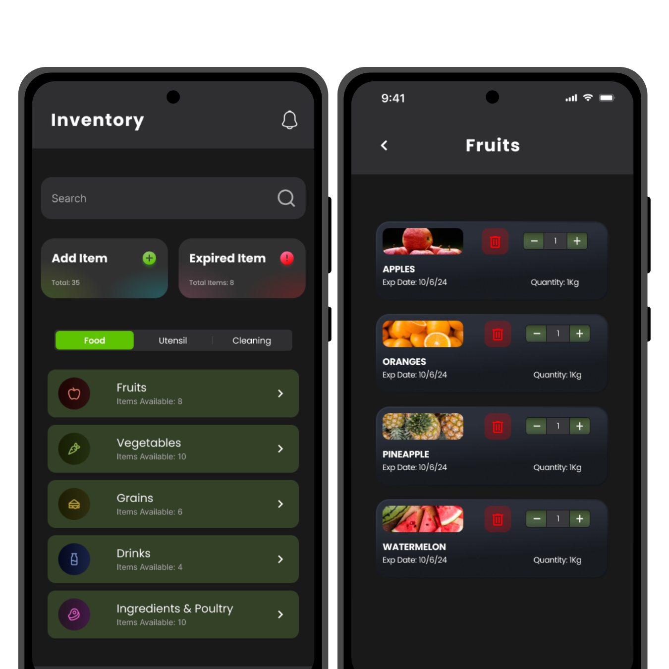 Categories & subcategories (Food → Fruits, Vegetables; Cleaning; Utensils)