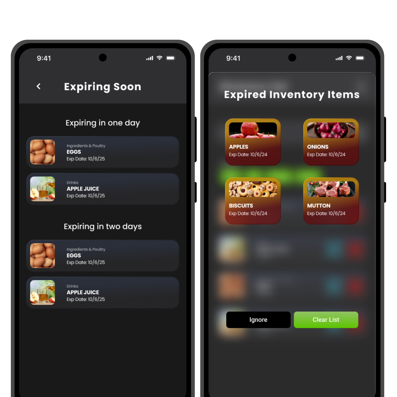 Expired Items: list with dates and two actions: Ignore or Clear.